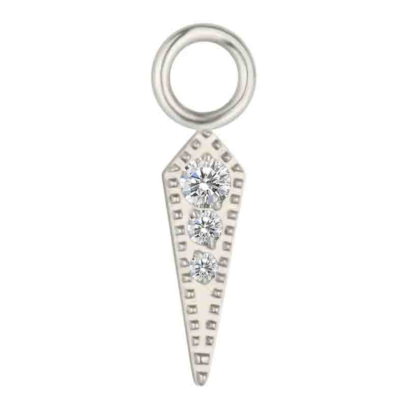 Gioiello pendente forma punta di lancia in titanio da implantologia f136 certificato ed anallergico, con zirconi neutri incastonati.Ideale da abbinare ad un clicker o altro orecchino