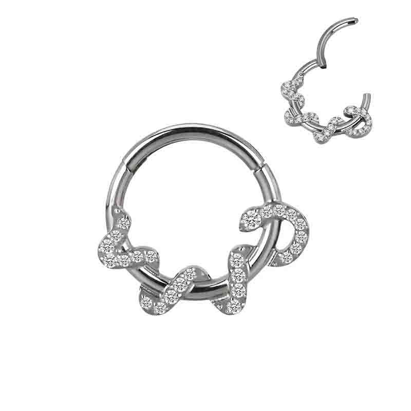 Clicker serpente in titanio astm f136 da implantologia certificato , tempestato di pietre cz stone taglio round con facile apertura e chiusura a scomparsa . Sicuro e anallergico . Misura 1.2 mm x 10 mm