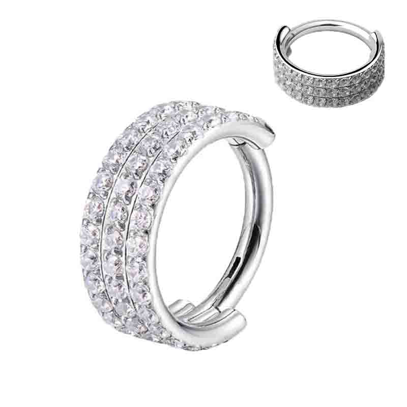 Clicker in titanio astm f136 da implantologia certificato con tre anelli tempestati di pietre cz stone taglio round neutre saldati insieme a formare un unico gioiello . Facile apertura e chiusura a scomparsa . Sicuro e anallergico . Misura 1.2 mm x 8 mm