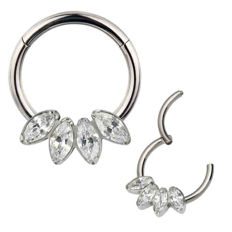 Clicker in titanio astm f136 da implantologia certificato con 4 pietre cz stone neutre taglio marquise . Facile apertura e chiusura a scomparsa . Sicuro e anallergico . misure 1.2 x 10 mm
