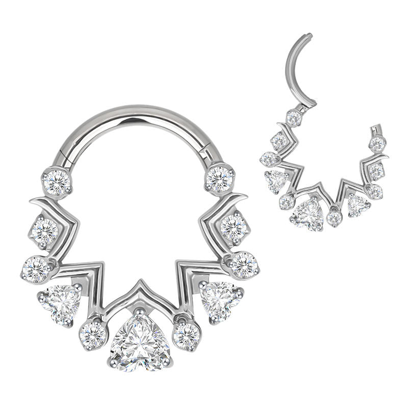 Clicker dal design geometrico in titanio astm f136 da implantologia certificato con pietre cz stone taglio heart e round . Facile apertura e chiusura a scomparsa . Sicuro e anallergico . misure 1.2 x 8 mm