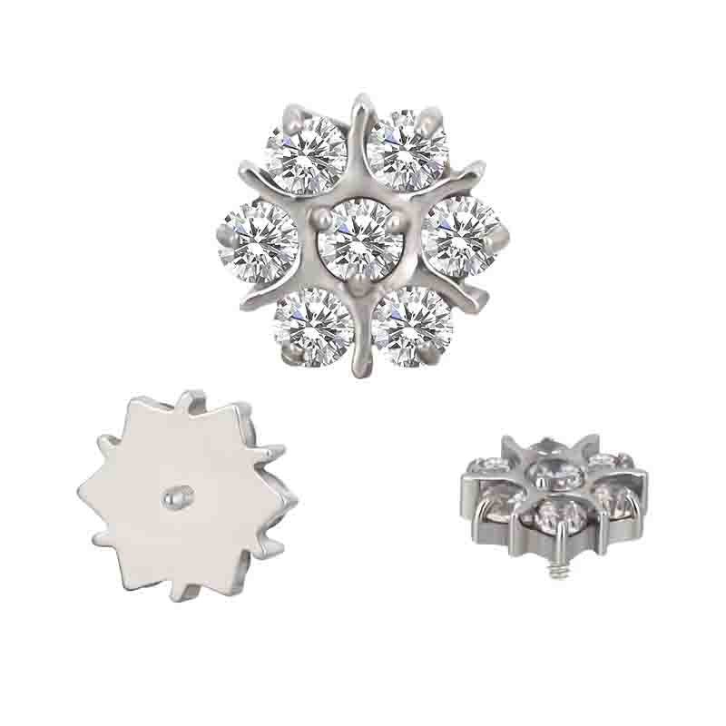 Fiore in titanio astm f136 da implantologia certificato e 7 pietre cz stone neutre taglio round . Filettatura interna e completo del suo labret . Sicuro e anallergico .